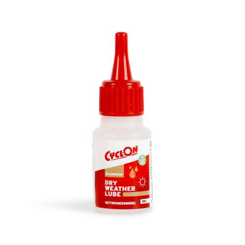Cyclon Dry Weather Lube 25ml. Droogsmeermiddel met minimale vuil of stof aanhechting. Te gebruiken tijdens droog weer omstandigheden. Geschikt voor kettingen, derailleurs, binnenkabels en schakelsystemen. Ook verkrijgbaar in een 125ml druppelflacon en in een 750ml verpakking., 21001
