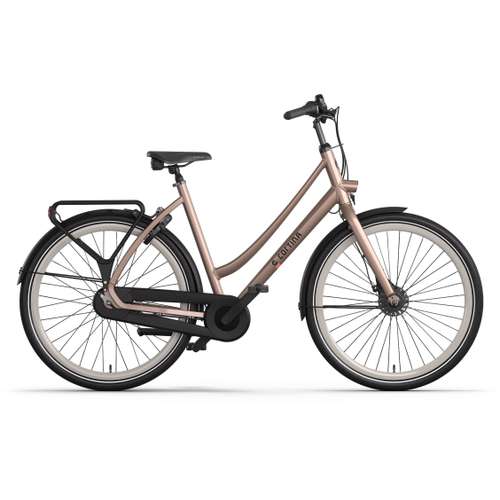 Cortina Tide damesfiets in framemaat 53 cm. Kleur: Dovi Sand. Uitgerust met achter een Shimano Nexus 7-traps versnellingsnaaf met rollerbrake en voor een Shimano naafdynamo met rollerbrake. Kleurcode: 09000-10598.